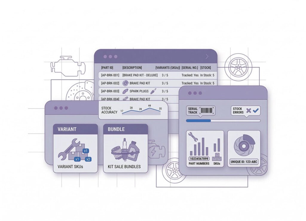 Auto parts inventory can be complex with multiple SKUs, variants, and part numbers for the same item. This feature manages multi-variant inventory effortlessly, tracks serial numbers, and supports bundle sales (e.g., kits), reducing stock errors and improving inventory accuracy.