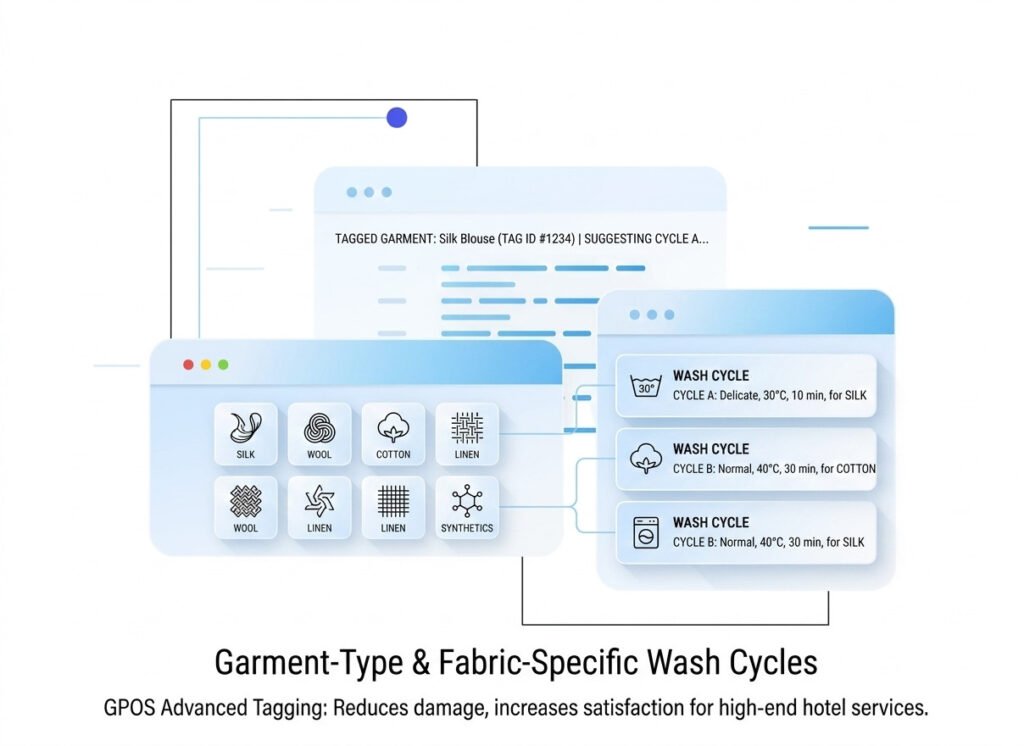 Unlike generic POS systems, GPOS uses advanced tagging of garments and fabric types to suggest wash cycles. This ensures proper treatment of clothes, reducing damage, and increasing customer satisfaction — crucial for high-end hotel services.